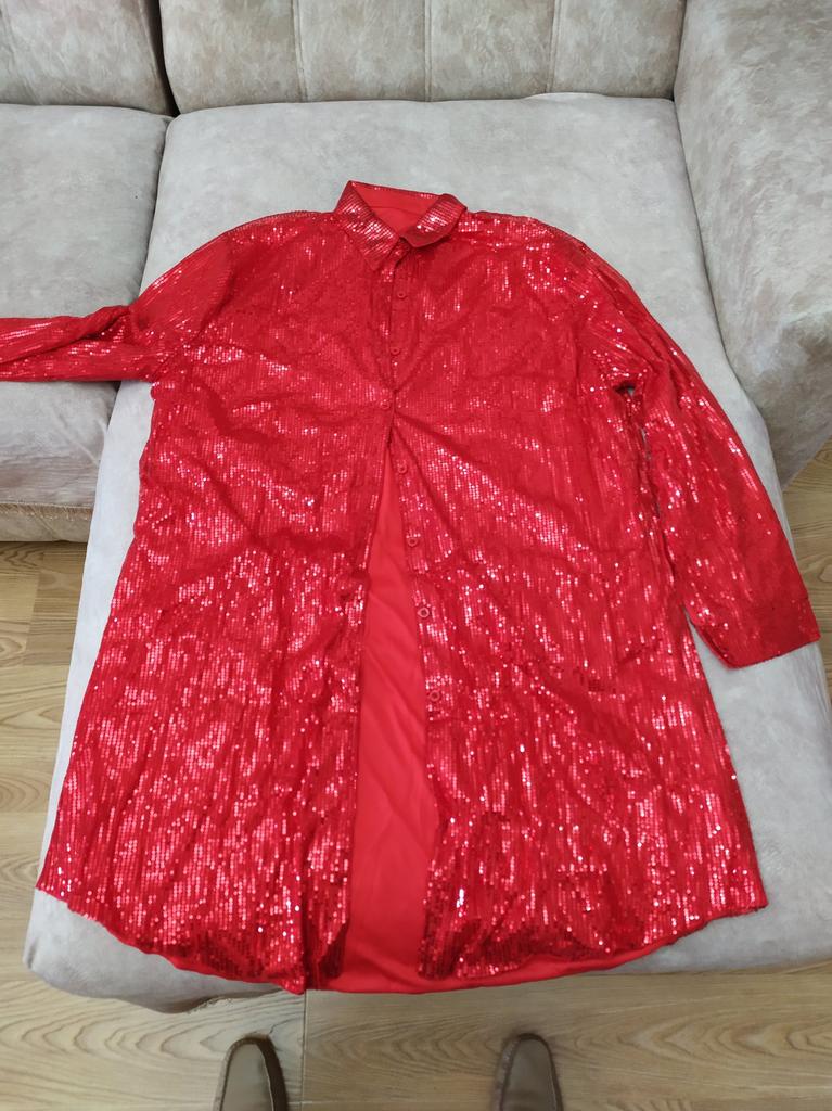 Představujeme naše úžasné dámské šaty s flitrovými knoflíky, perfektní doplněk do vašeho šatníku tuto sezónu. Tyto šaty mají třpytivý flitrový design s košilovým topem na knoflíky, dlouhými rukávy a volným, pružným střihem pro maximální pohodlí..