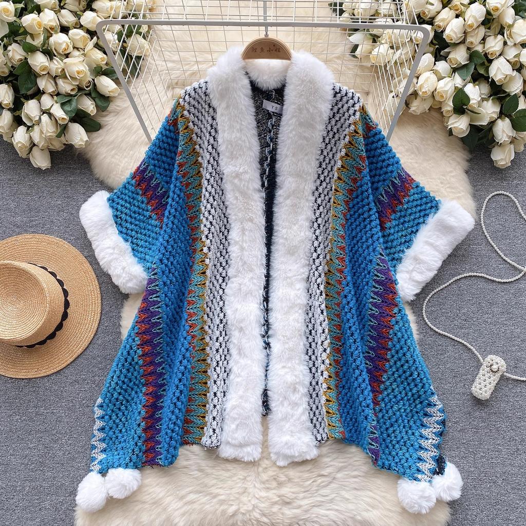 Chic Ethnic Style Color Collision Shawl Sweater Jacket Women Patchwork Soft Warm Hairball Cape Cloak Knitted Cardigan