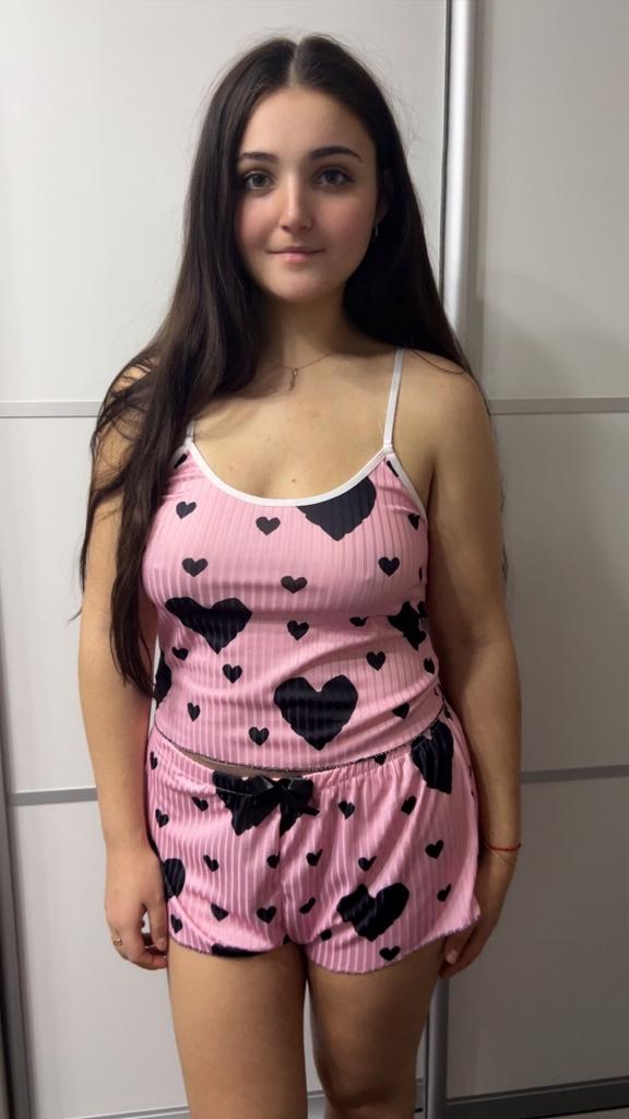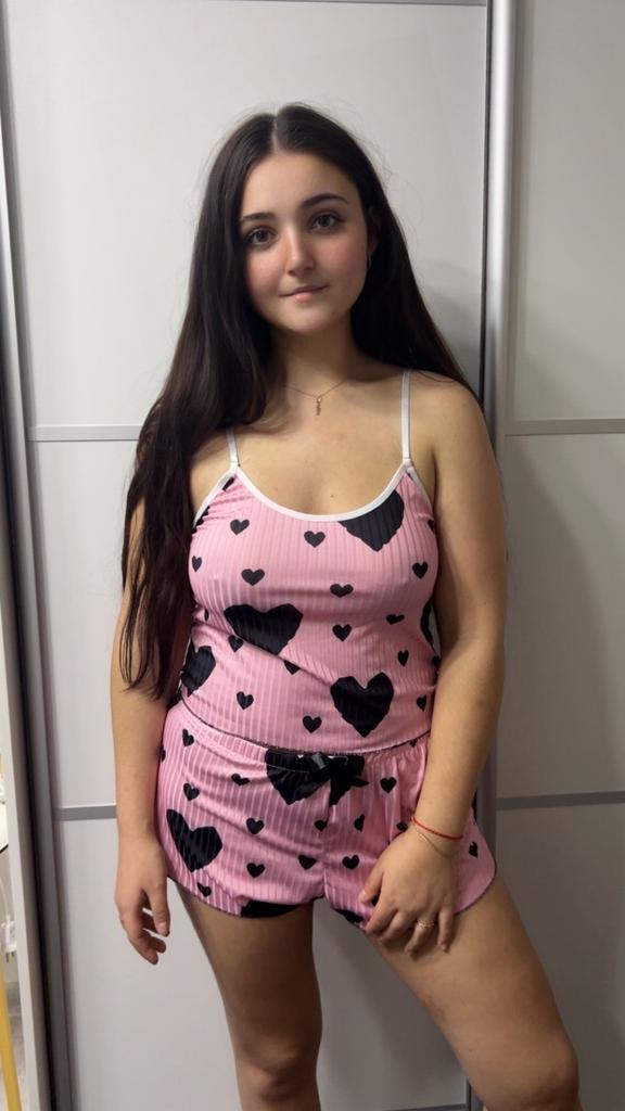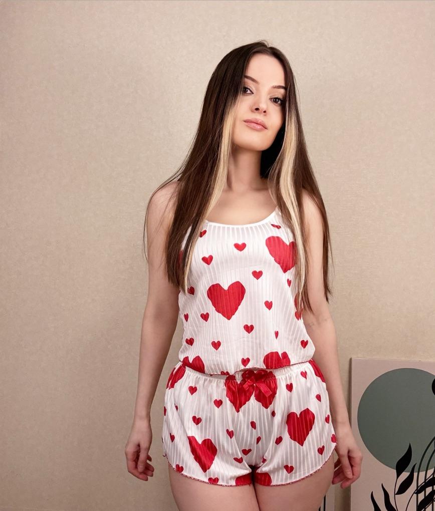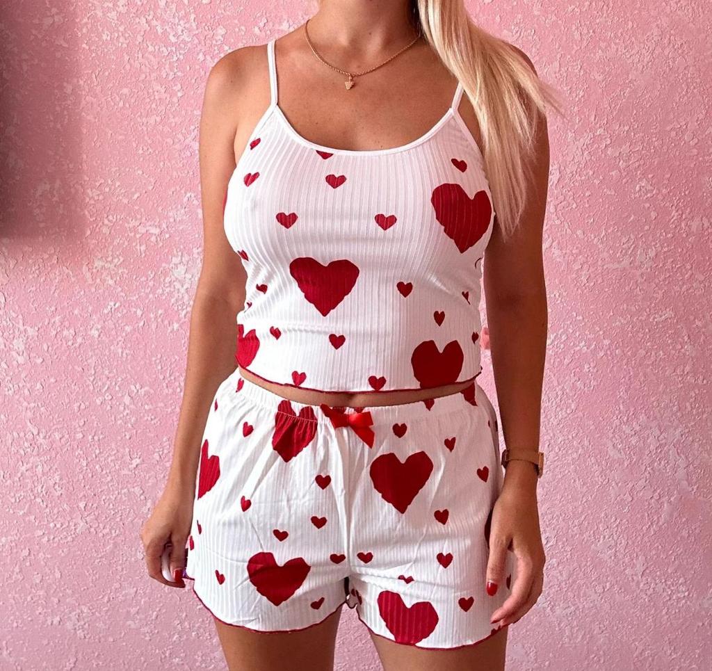 This pajama set is designed for summer and combines comfort with a light and fresh look.: *Characteristics: - Includes a *spaghetti strap tank top* and shorts – suitable for warm nights. - *Knitted polyester fabric* – soft, breathable and ventilated. - *Love Print* design in a geometric style – gives a young and casual look. - *Sleeveless*, light and comfortable to move in. - *Sizes*: S, M, L. - *Main Color*: White. Suitable for sleeping, relaxing at home, or just for a calm and pleasant day.