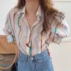 Dopamine Wear Women's Colorful Striped Short-Sleeve Shirt - Cute, Sweet, Loose Fit, Mid-Length for Summer