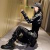 Suit Crop Tops Pants Two Piece Female Sets Buckle Streetwear Jacket Pant Suits Ladies