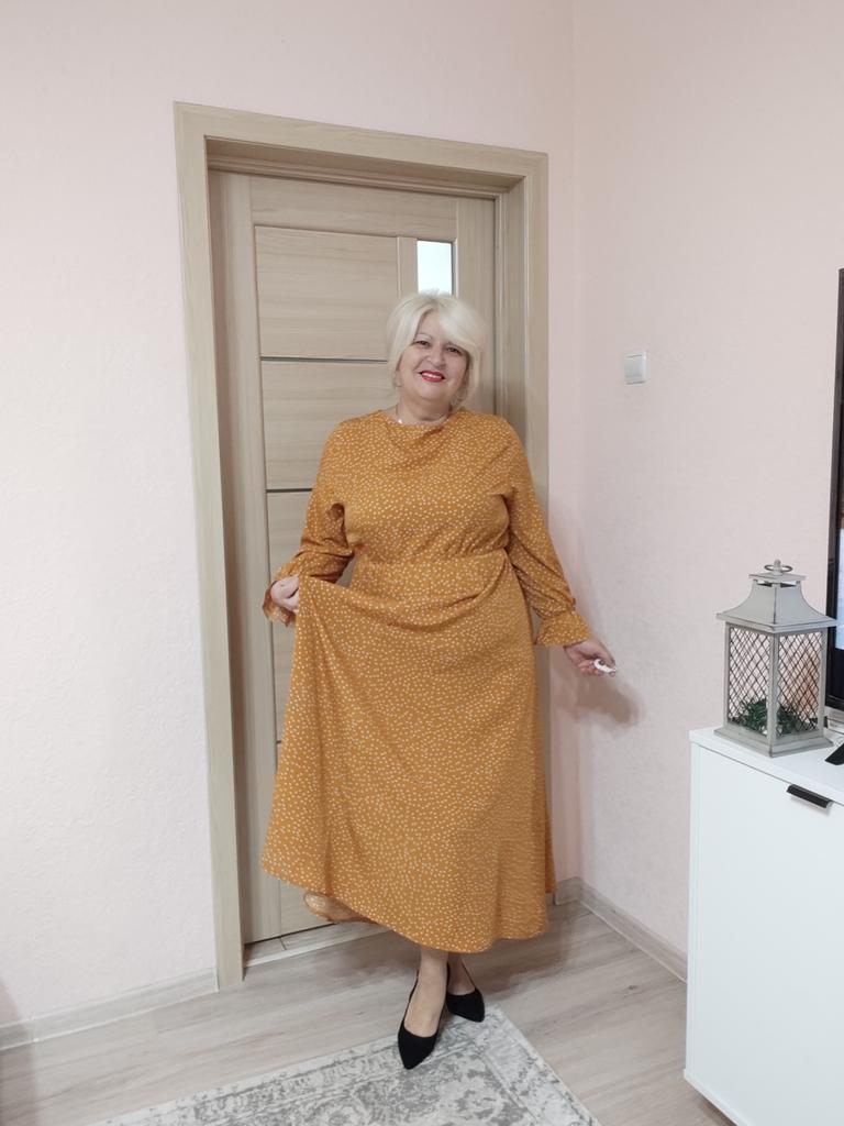 This dress is simply spot on! Let's start with the fact that it's *loose*, which means it's super comfortable and flattering – not too tight, sits nicely, and flows with the body. The polka dot print gives it such a timeless look – classic, but with a young and refreshing twist. The long trumpet sleeves add a subtle and special chic, and elevate the whole look.. The round collar maintains a modest and tidy appearance, and the long length of the skirt is very suitable for spring and autumn – just when it's not cold but also not too hot.. *The fabric (100% polyester)* feels light, doesn't cause sweating, and is easy to maintain – hand wash and that's it, no drama. In summary, this is a wonderful dress for everyday wear or for casual events, incredibly comfortable, looks great, and fits well even on a full figure. A dress that makes you want to go out! 💃