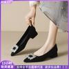 New rhinestone suede thick heel single shoes spring 2025 versatile pointed head shallow mouth low heel French black work