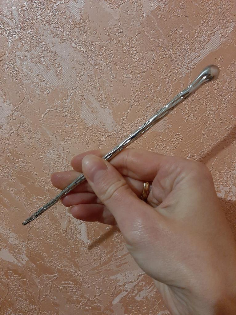 Denne hårnålen er litt lengre enn andre pinner jeg har, noe som gjør den perfekt for tykkere hår. Det er også et lite hull i den ene enden av pinnen, jeg tror det kan være der for å feste noe til den