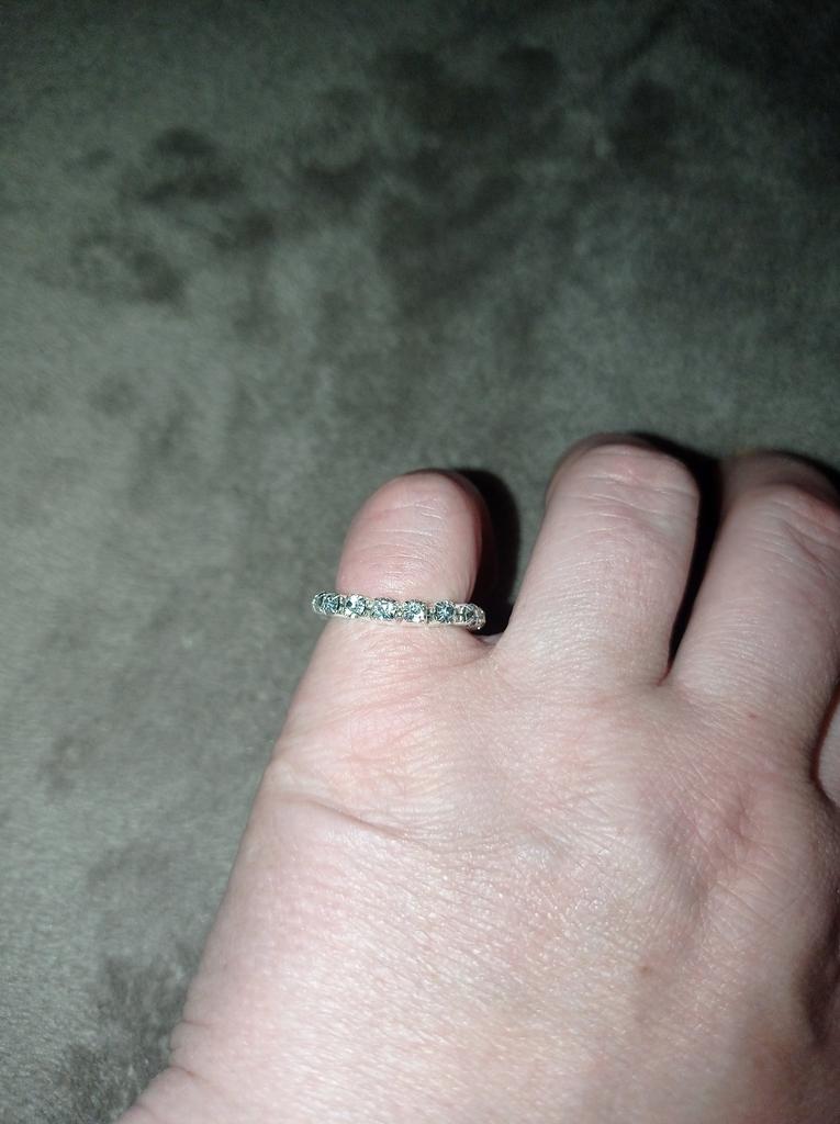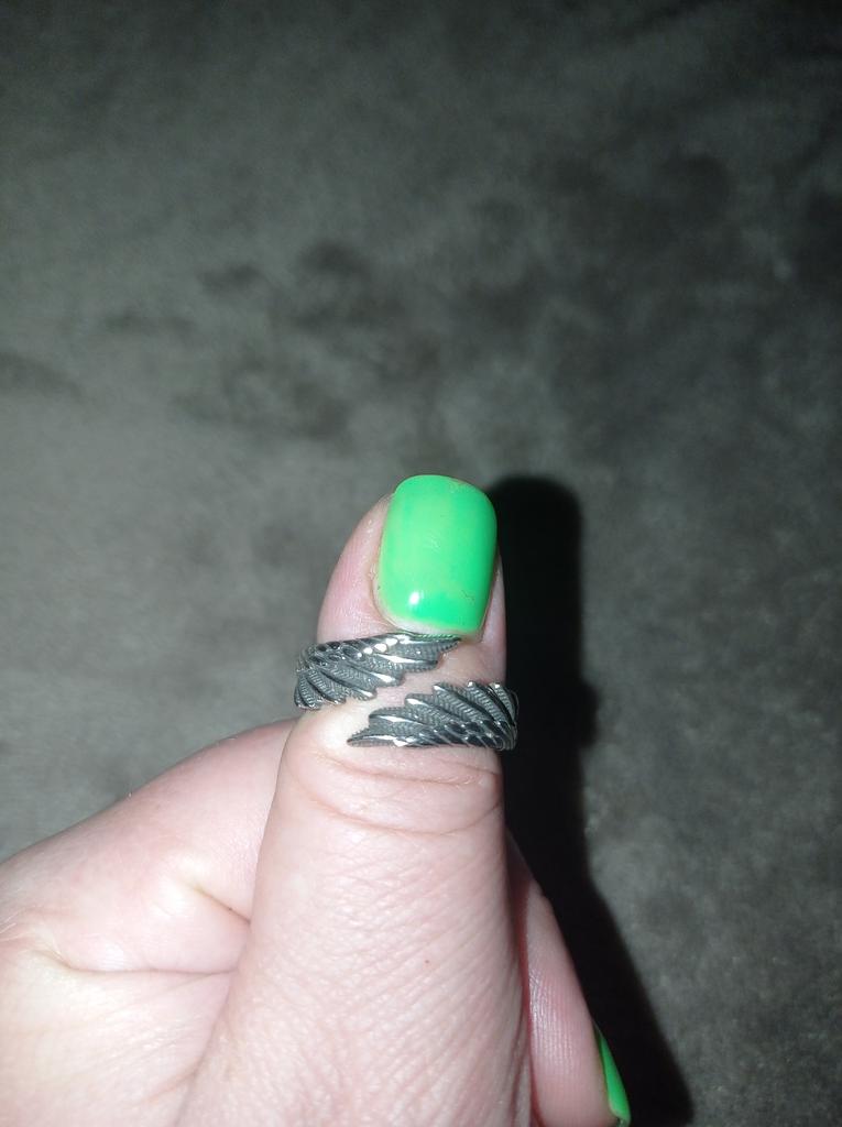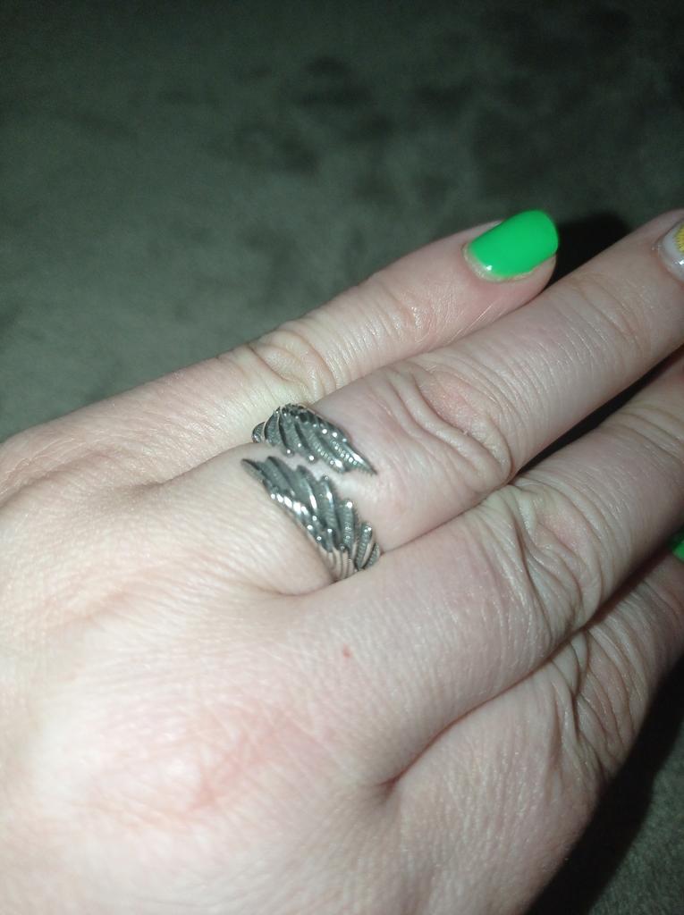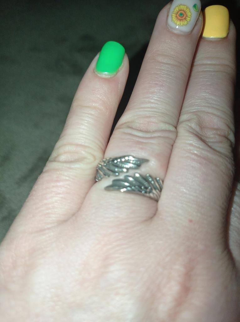 Ringen er justerbar, noe som er et stort pluss for meg med mine tynne fingre. Selve ringen er ganske bred, men den ser flott ut.