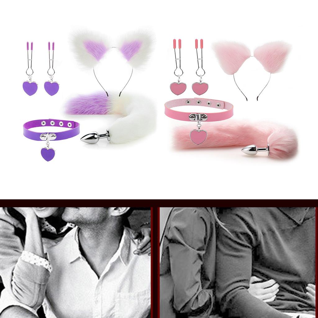 Stylish and unique design, headband with for cat ears, metal butt plug with emulational foxes tail,heart collar,clamps , it is prefect sex toys stimulator for couples women men gay.