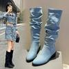 Shoes Female 2024 New Women's Boots Pleats Denim High Boots Autumn Thick Heels Pointed Toe Cowboy Boots Woman Western Long botas