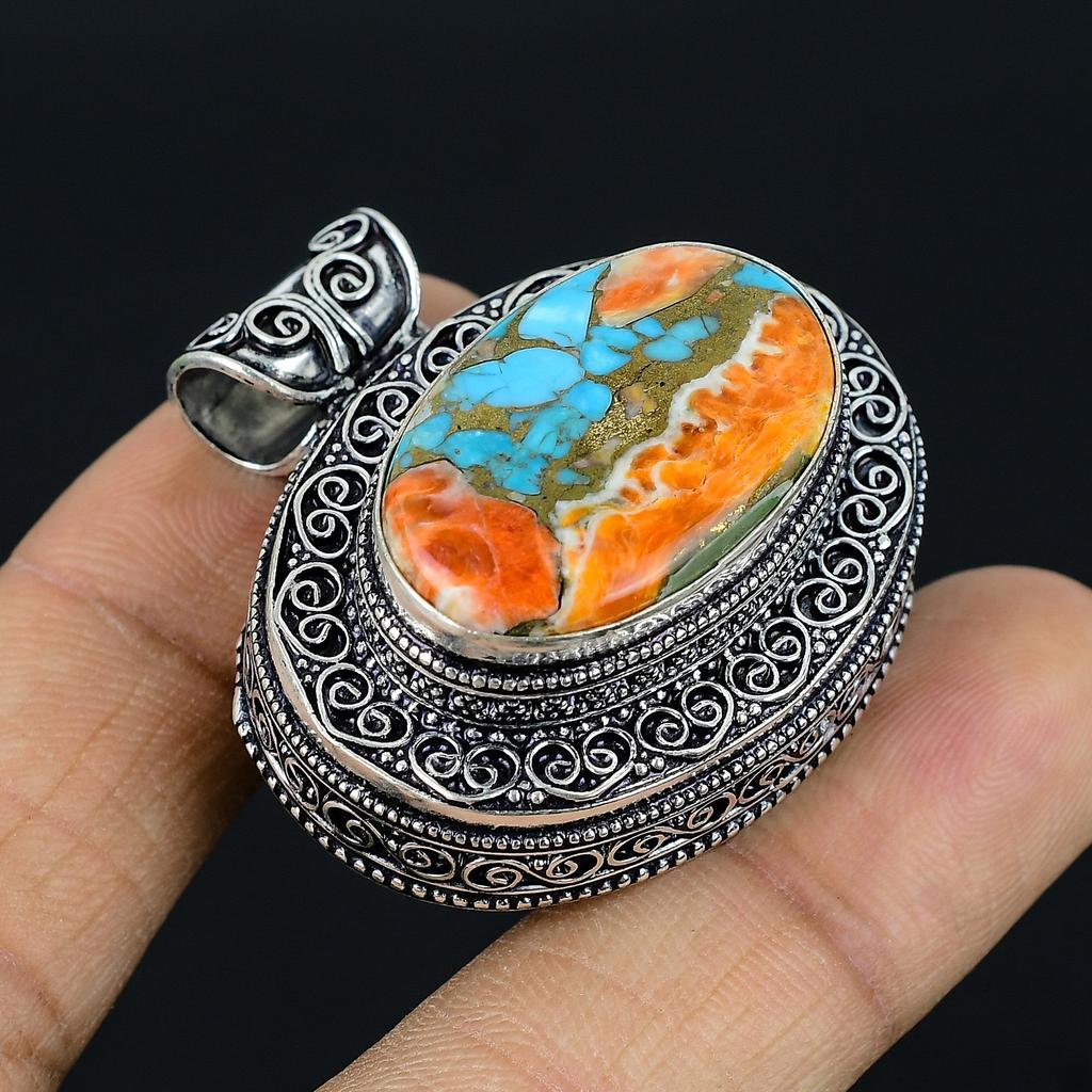 Spiny Oyster Gemstone Handmade Ethnic 925 Silver Gift Jewelry Pendant 1.6" u6E09