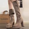 Fashion Non-Knee High Boots Women's Fashion Round Toe Platform Metal Buckle Suede Non-Slip Wear-Resistant Block Heel Single Boots
