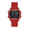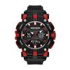 Case size 46mm, band width 22mm, mineral crystal, quartz movement, three-hand date analog display, imported. Round alloy case with black dial. Red, silicone band. 30m waterproof: Splash-proof.
