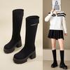 Women's Black Suede Knee-High Boots - 8CM Height Increase, Thick Sole, Plus Velvet, Elastic, 2025 Autumn/Winter Collection